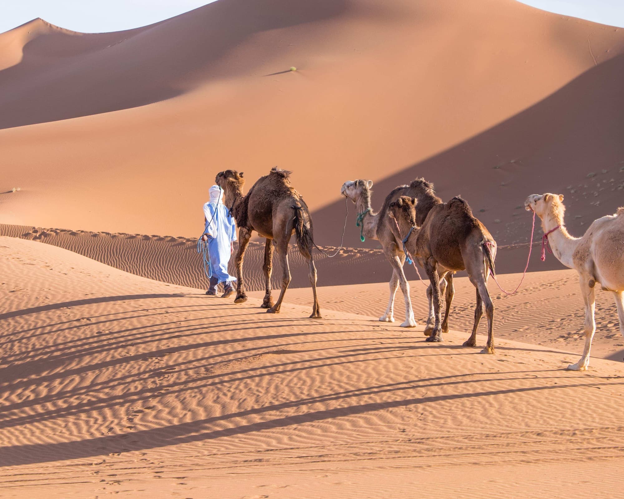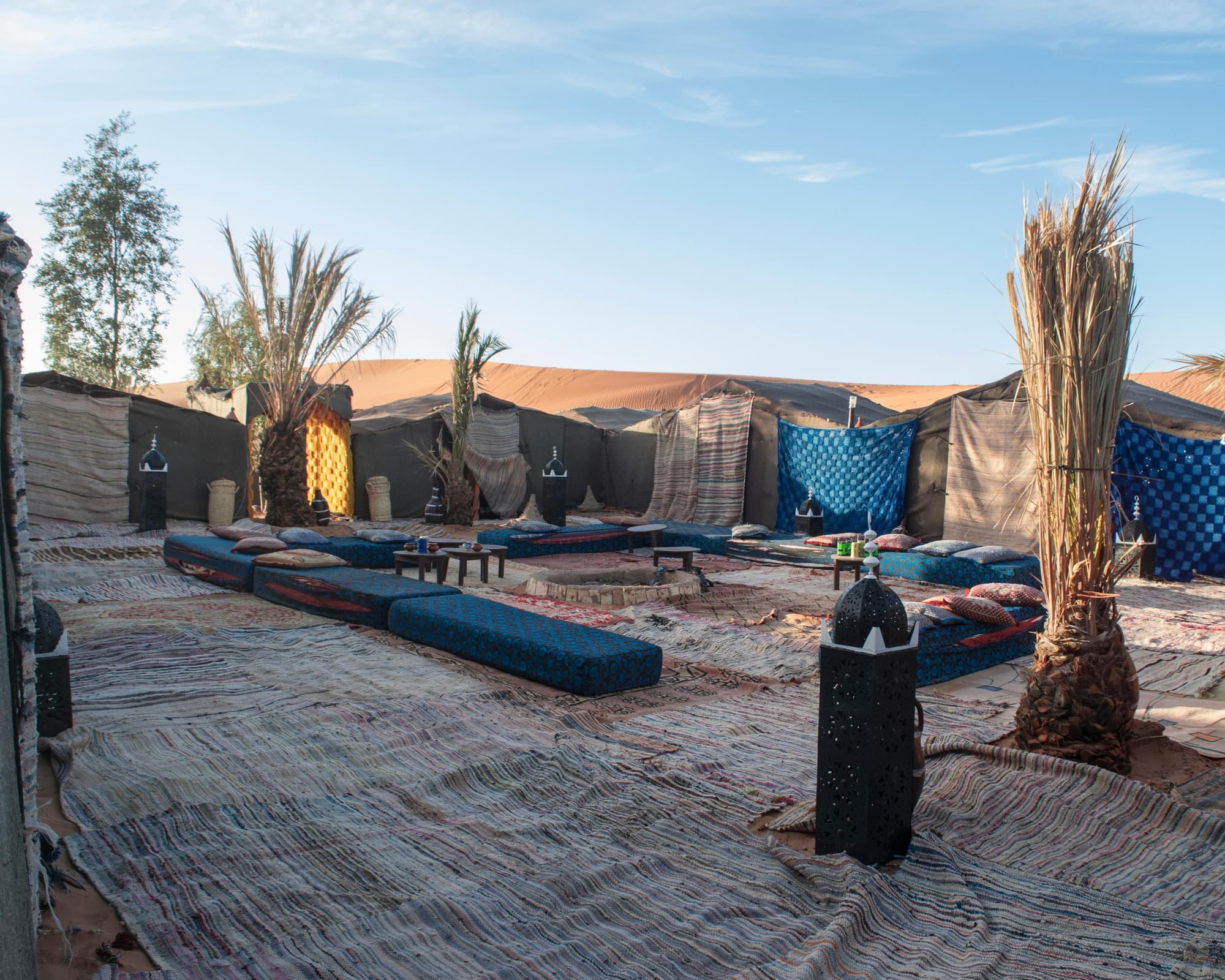 Wake up to a stunning sunrise, enjoy some breakfast at camp and then start the day. This is our second day of the Berber desert journey. Then you have a choice of walking or riding a camel to our lunch stop. Enjoy the sights and sounds of the Sahara as you travel like people have for millenniums. After lunch we’ll enter the 21st century again and travel to the next desert camp by 4x4. Arrive at the oasis of Bertam to catch sunset before having dinner fireside with stories and music.